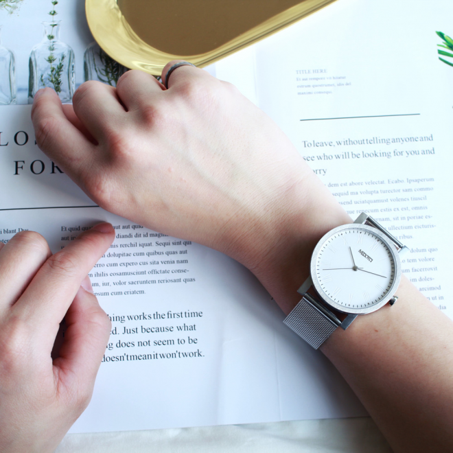 Design of Minimalism, under the elegant clean surface and dent's Roman numerals and meticulous production process into a stainless steel case with a pointer and convey the meaning of original and simple.
